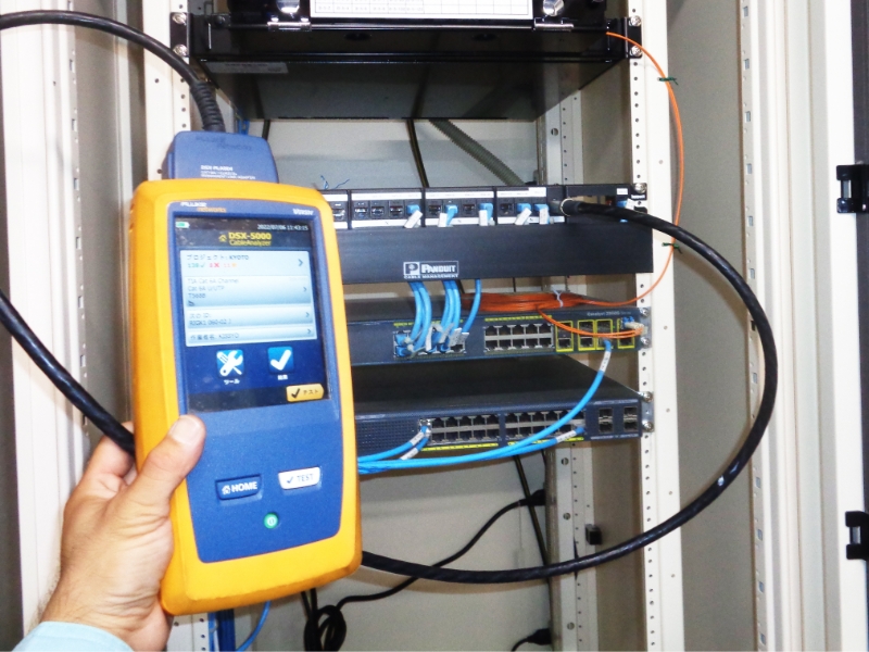 LANケーブル配線後にケーブル伝送試験をし配線の減衰やノイズを検知し確実な施工でネットワークの大容量・高速化に対応します。